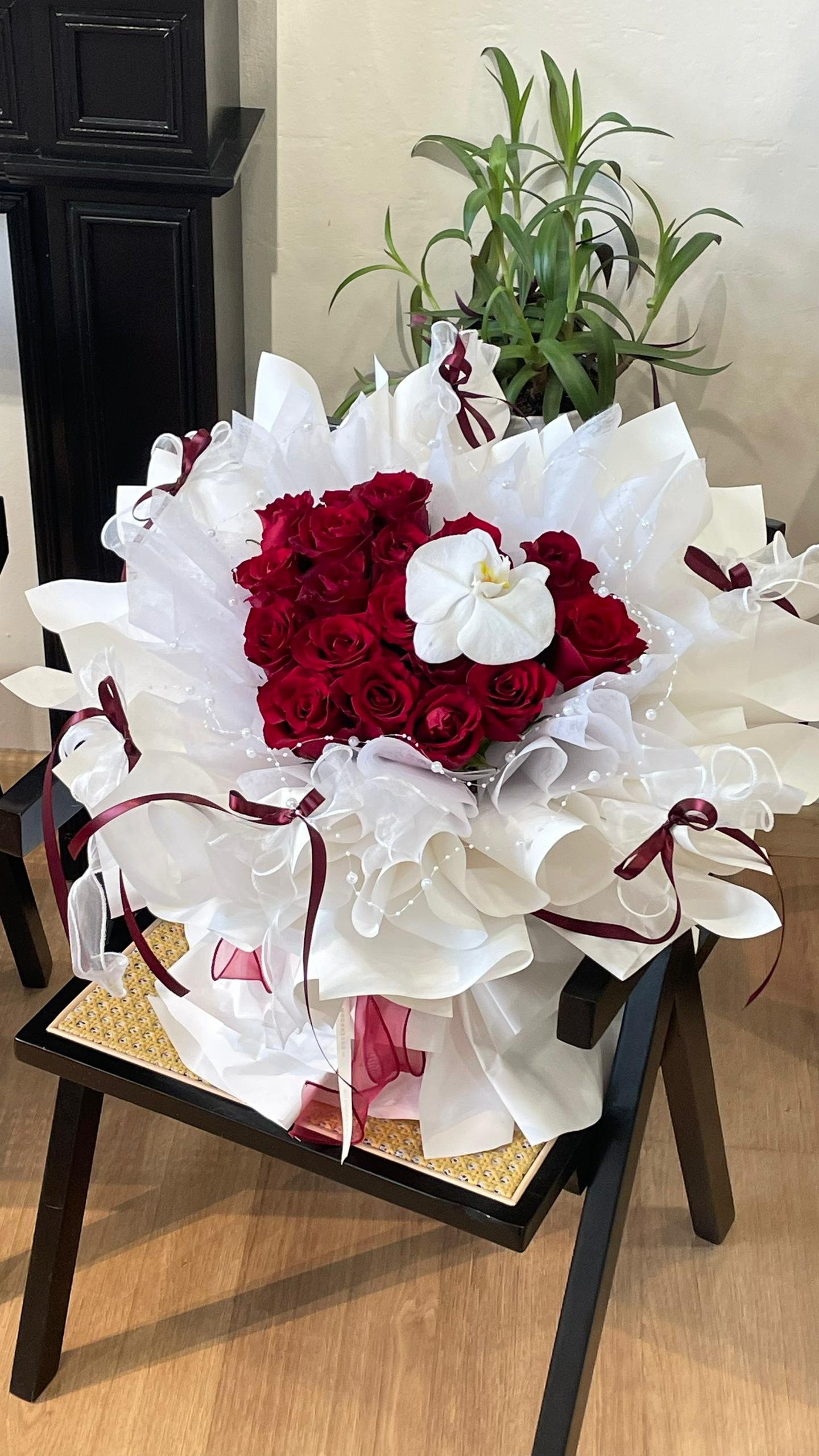 20 stalks red rose with white orchid