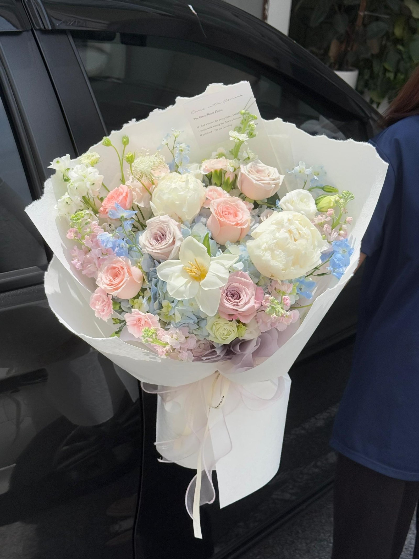Blue Hydrangea, white peony, white tulip, manta roses, pink roses, white & pink mattiola, pink spray carnation, mini blue delphinium , white eustoma and trachymene coerulea