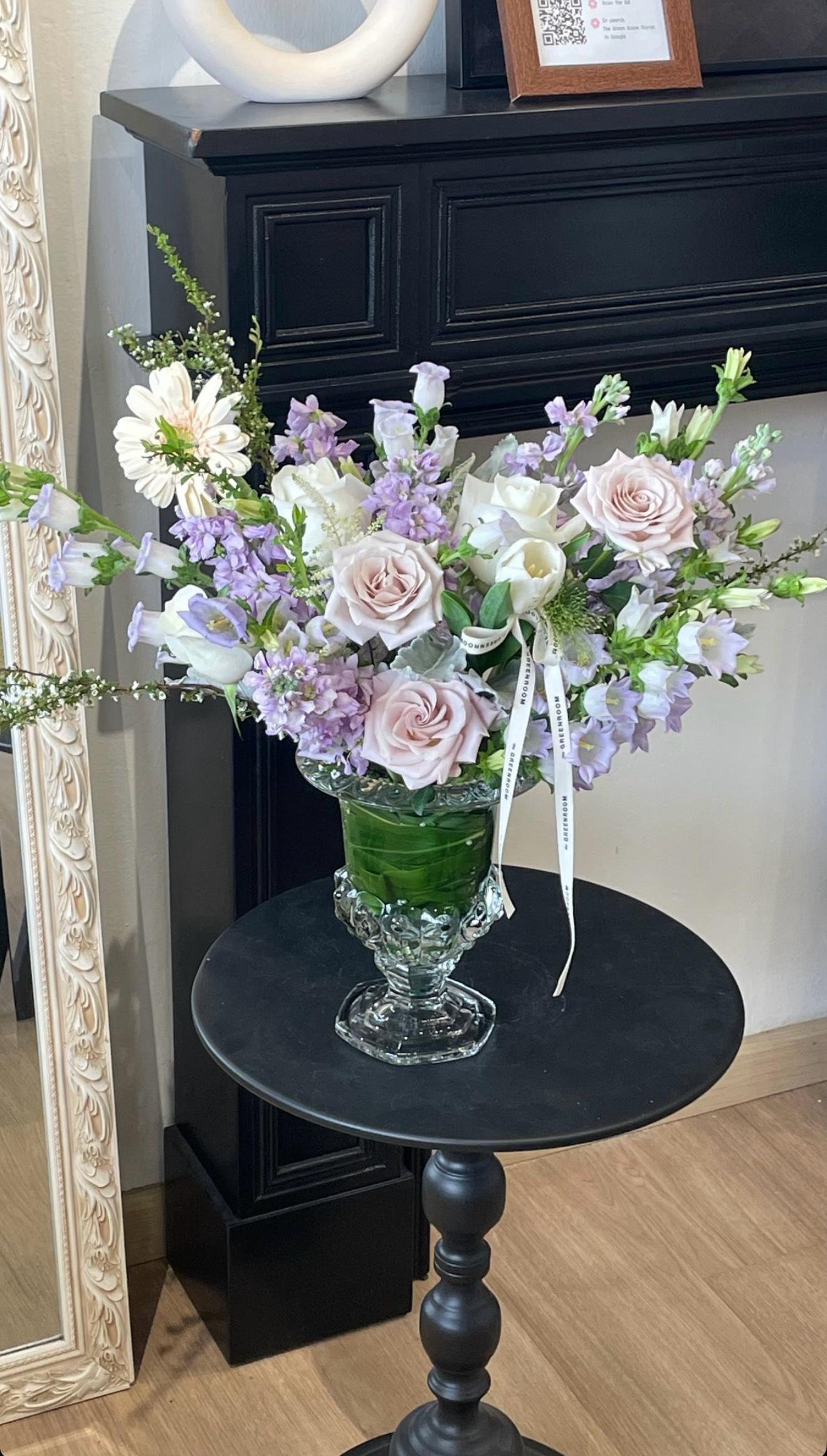 Manta Rose, Daisy Gerbera, Purple Mathiola, Bellflowers, White Tulips and Fillers