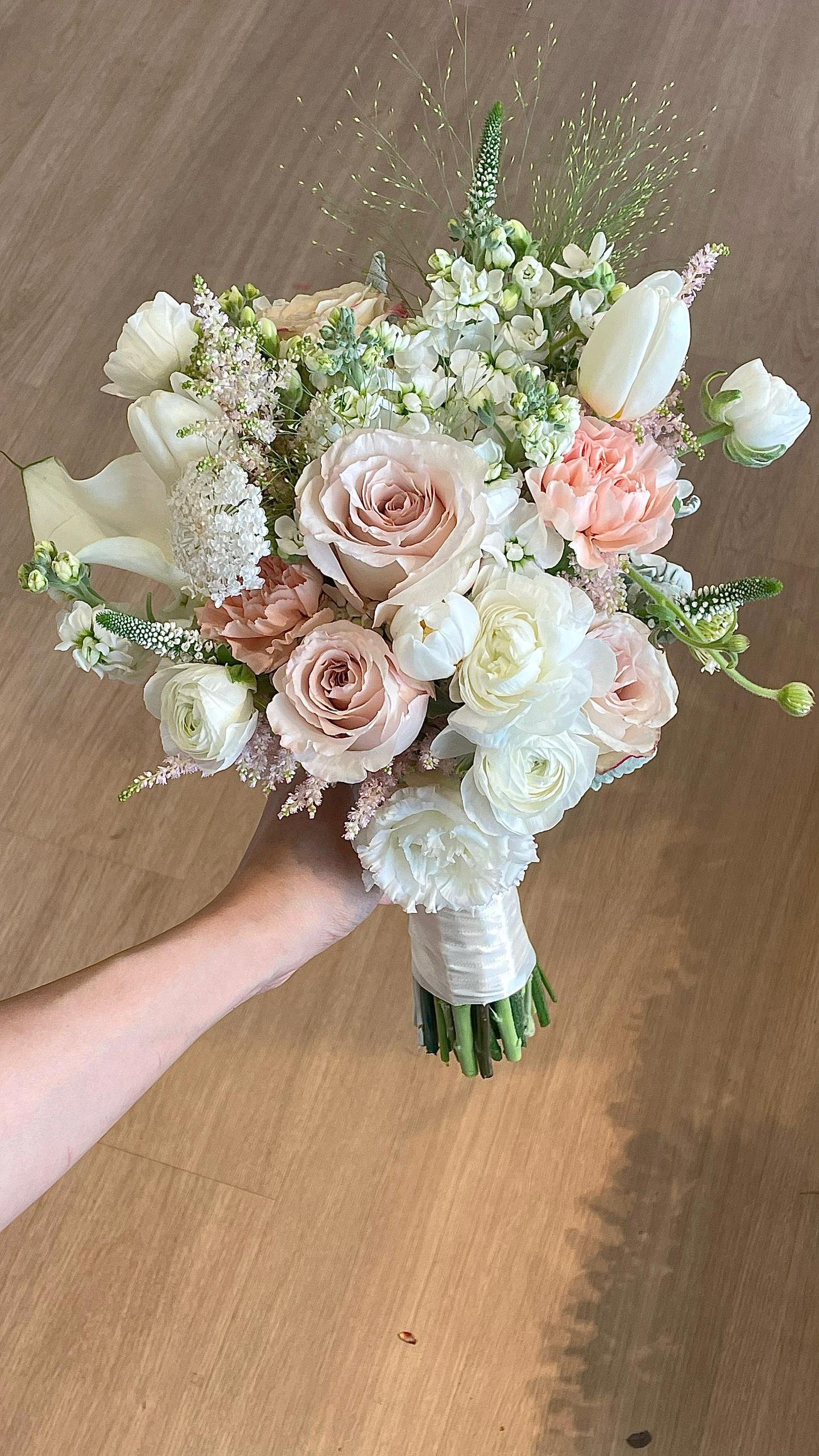 Calla Lily, Roses, Carnation, Mathiola, Ranunculus, White Tulips, Astilbe, Oxy White and Fillers