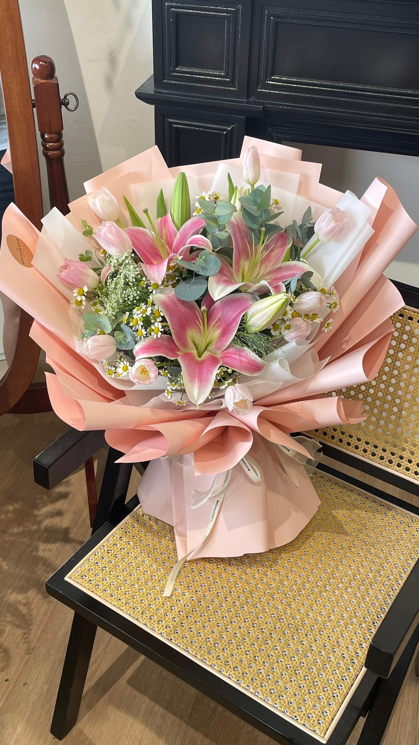 Pink Lilies, Pink Tulips, chamomile and fillers