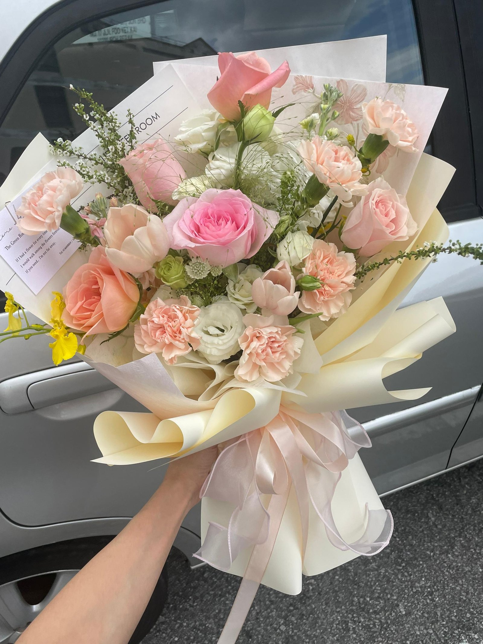 Tulips, Roses, Carnations Eustoma, Mathiola, Dancing Lady, Astrantia and Fillers