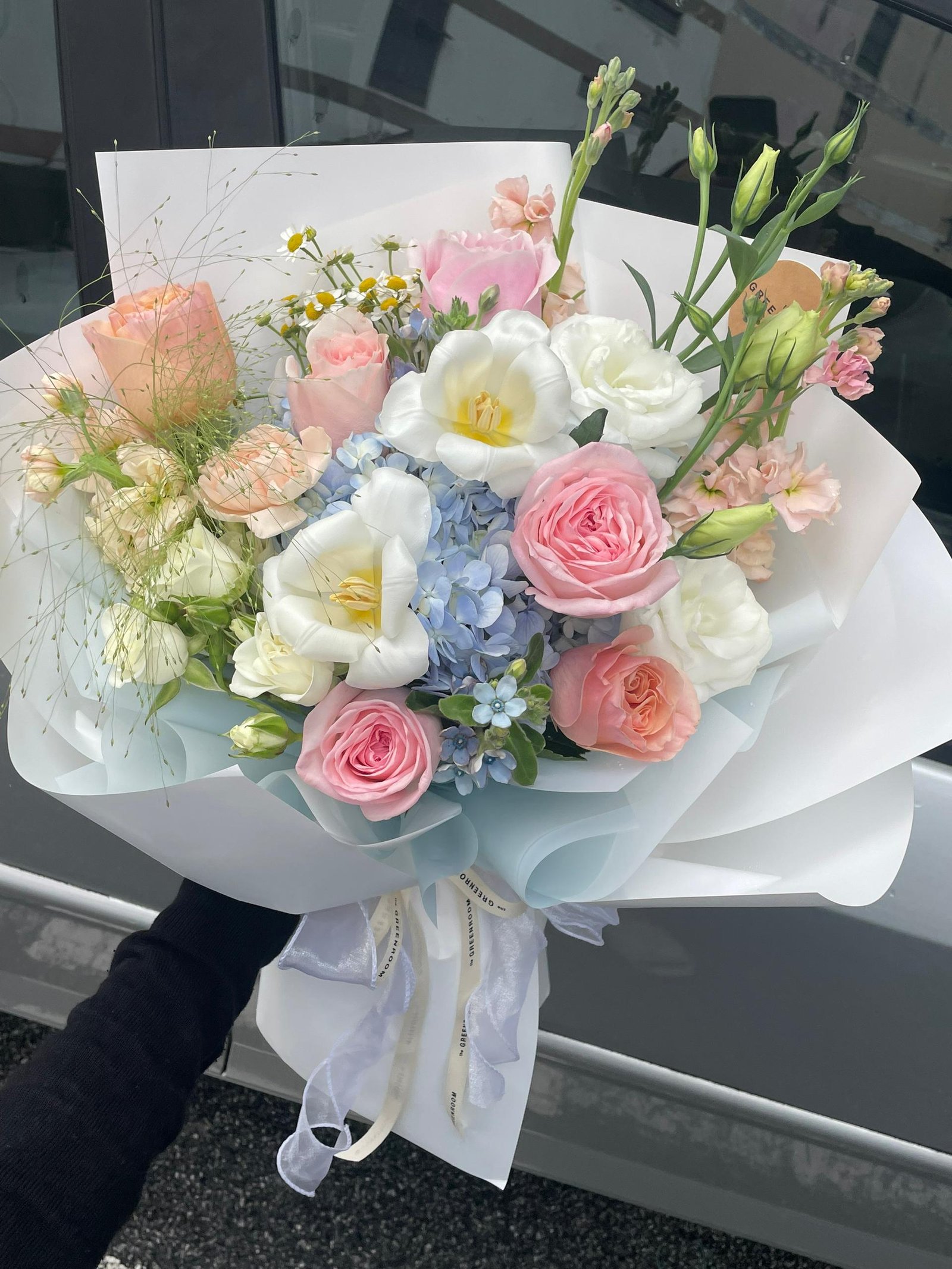 Blue Hydrangea, Roses, Tulips, Spray Roses, Chamomile, Oxy Blue, Mathiola, Carnation, Eustoma and Fillers