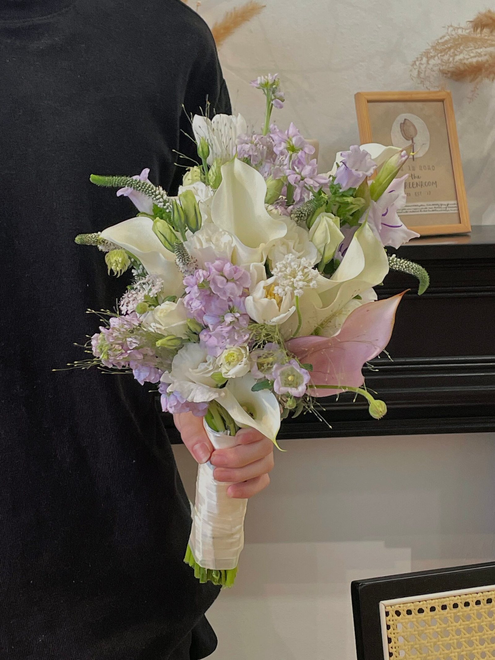 Calla Lily, White Tulips, Purple Mathiola, Purple Sword Lily, Campanula and Fillers