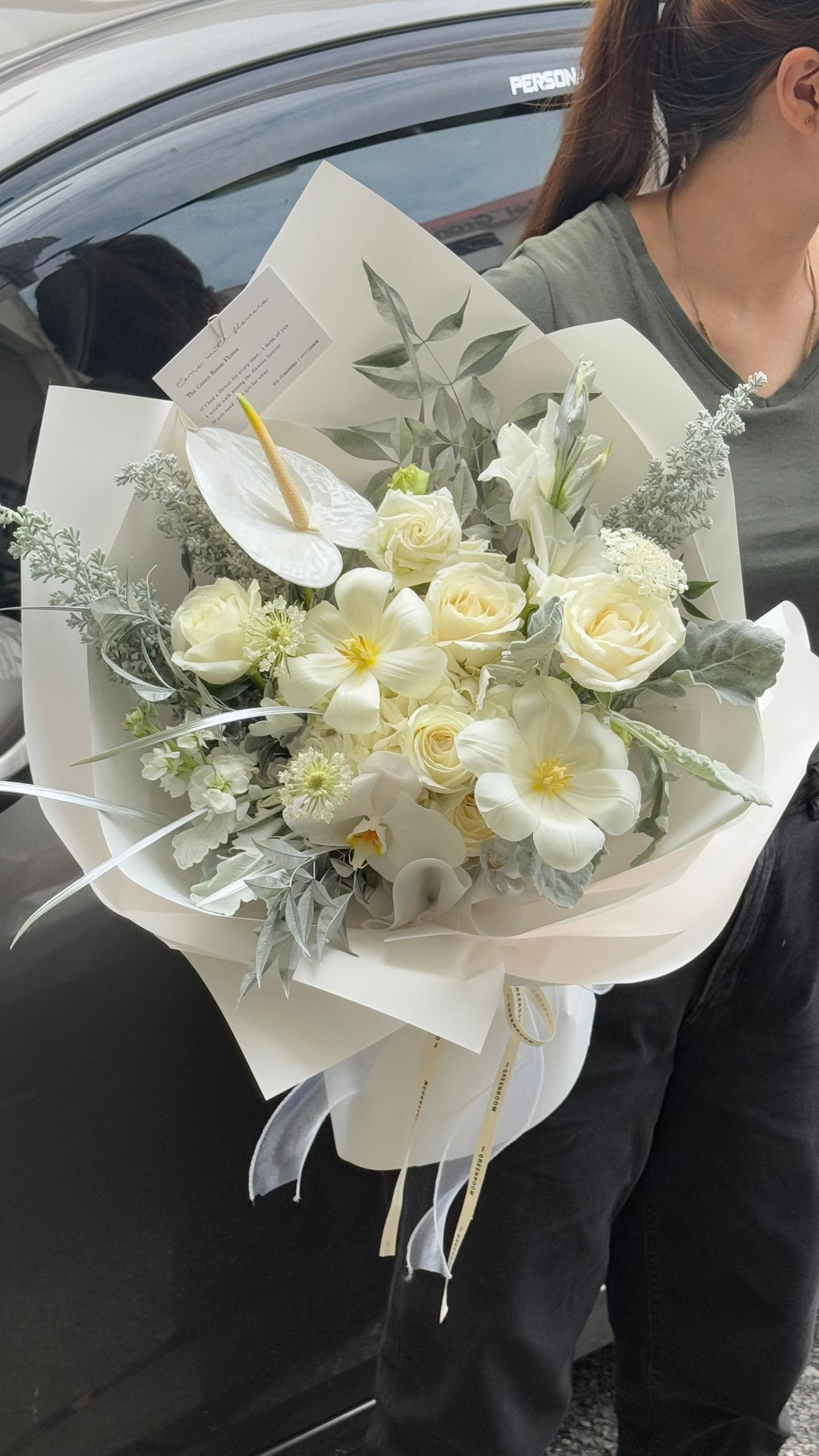 White Tulip, white hydrangea, white roses, white phalaenopsis cut, white mathiola, white sword lily, white anthurium and fillers