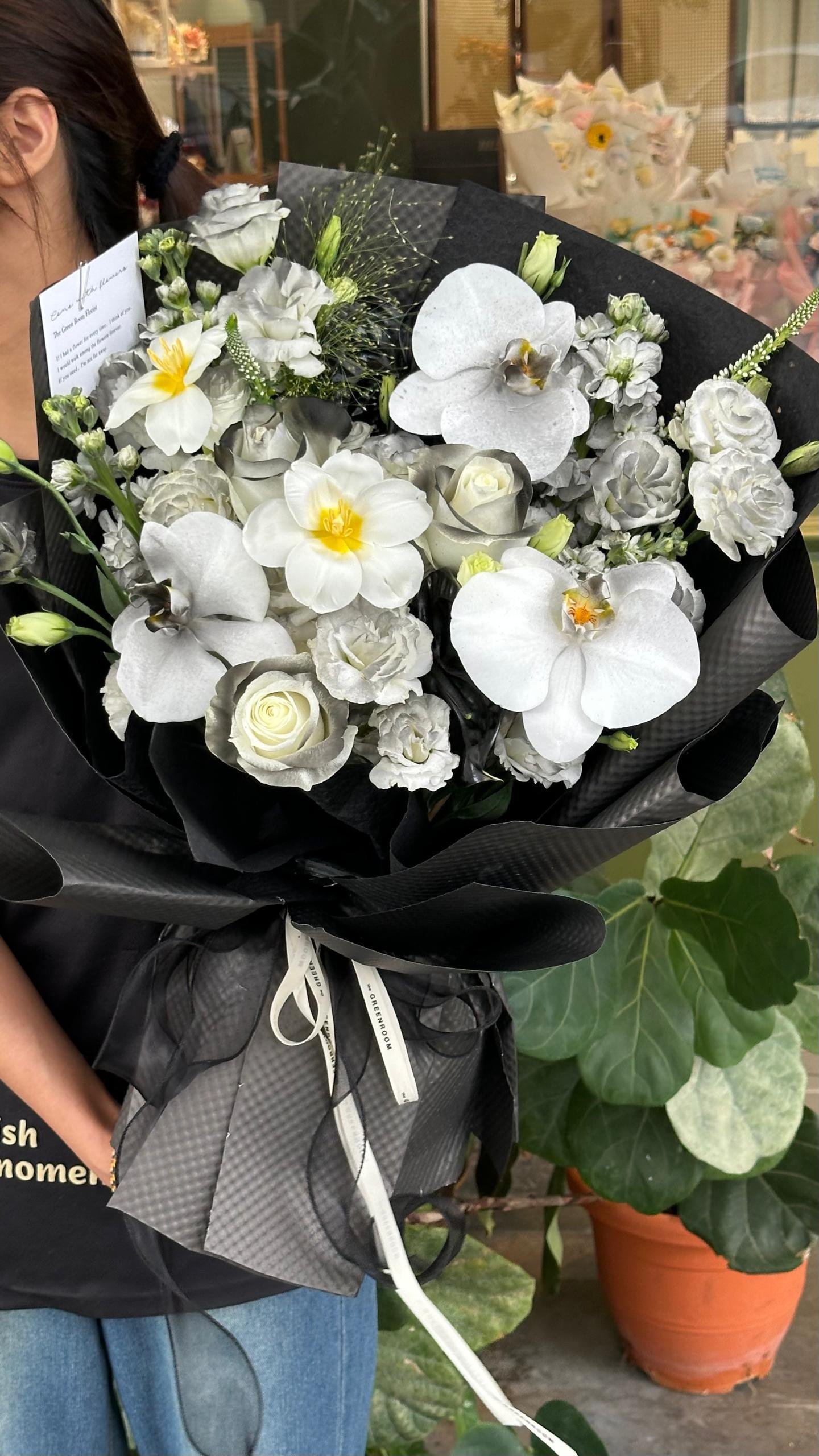 White Tulip, white roses, white eustoma, white phalaenopsis cut, white mathiola and fillers