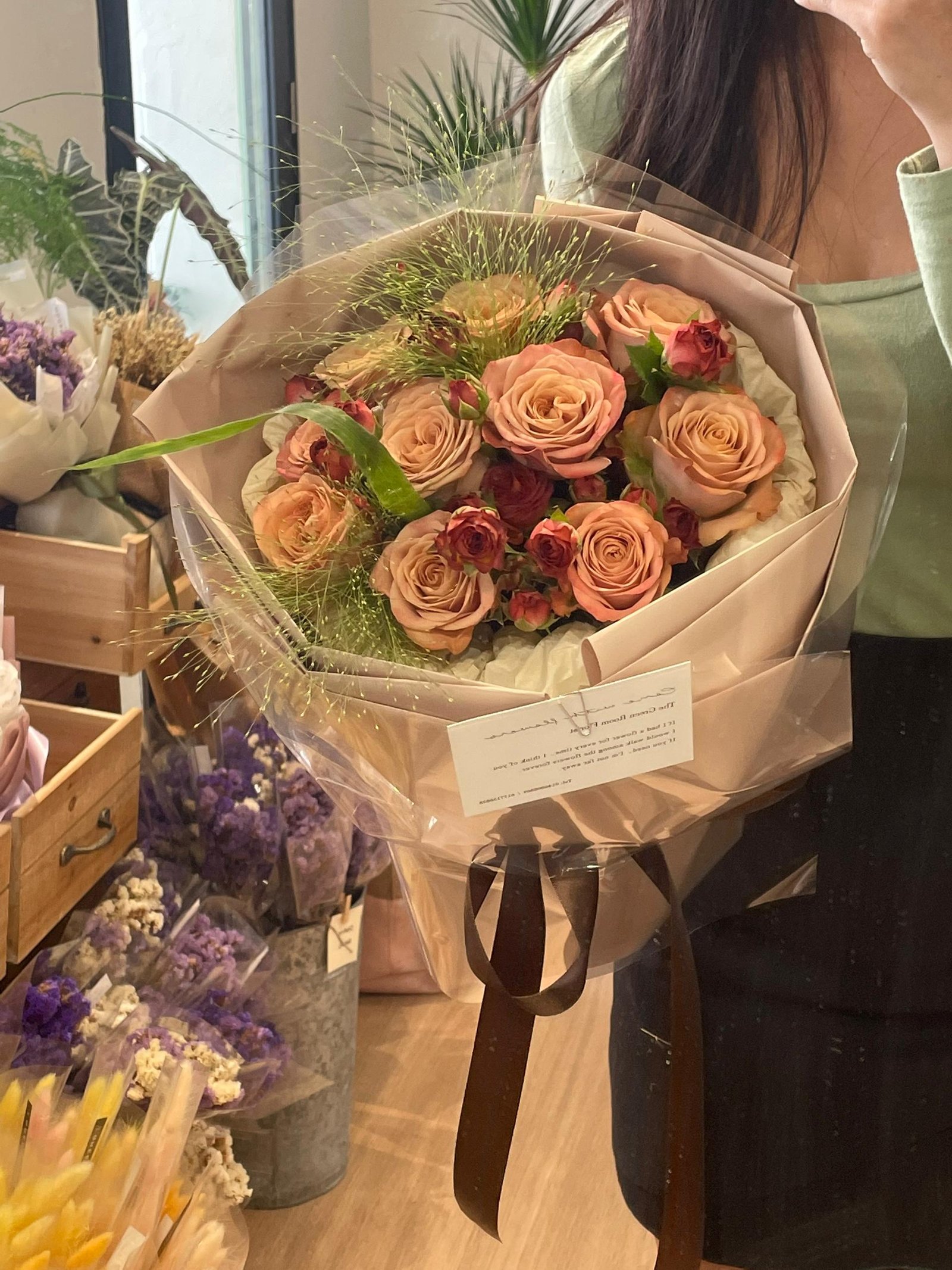 9 stalks cappuccino rose, chocolate bubble spray rose and panicium