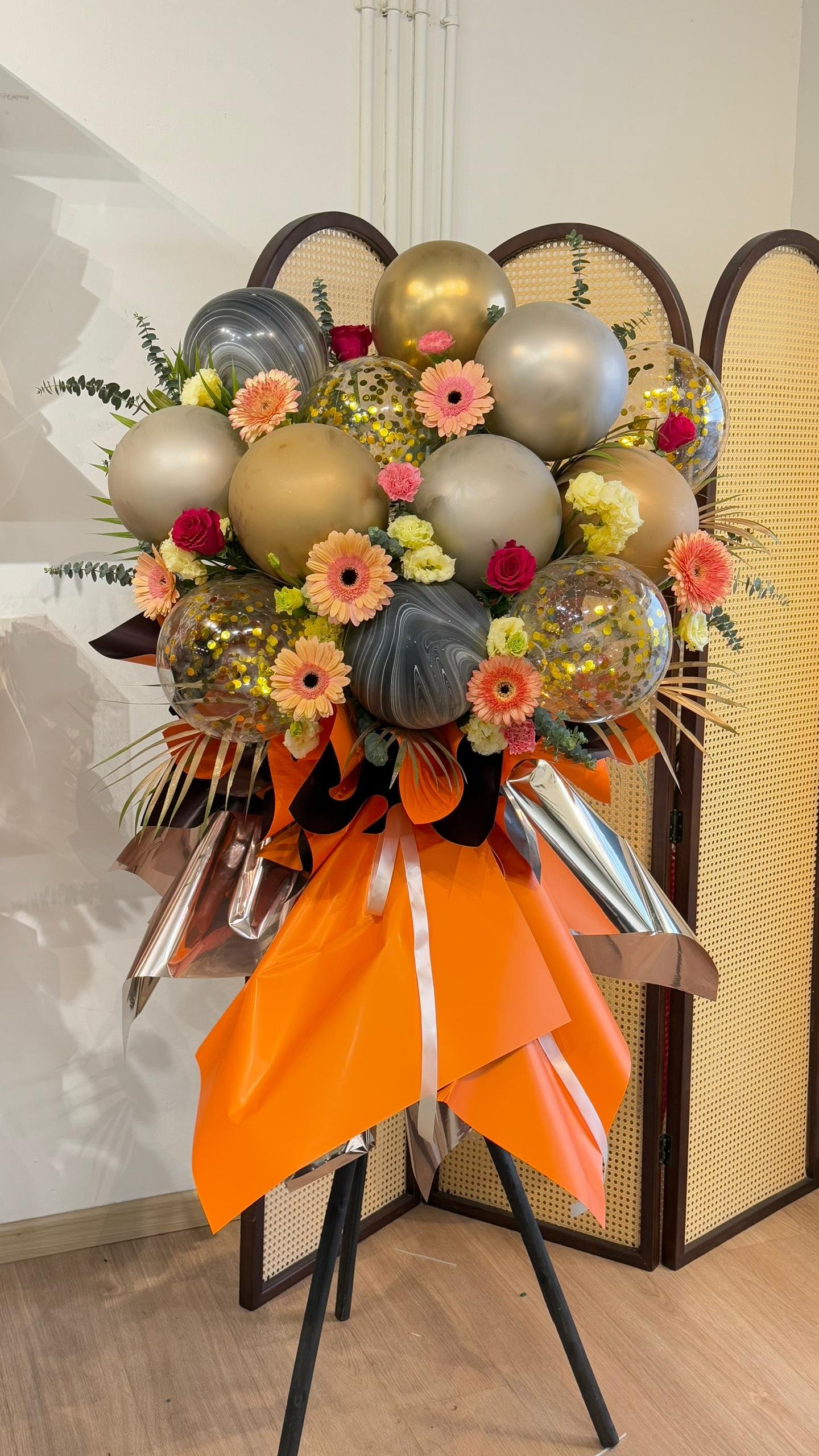 Balloon, Rose / Daisy Gerbera, Eustoma, Palm Leaves and Fillers