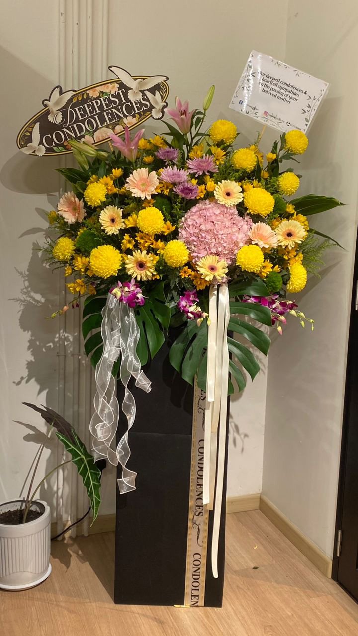 Blooms Pink Lily, Gerbera, Purple Anastasia, Pink Hydrangea, Yellow Mum Chrysanthemum, Yellow Chrysanthemum Pompom, Orchid and Fillers. Size 75 cm (W) and x 185 cm (H) Perfect for Condolence, Funeral