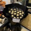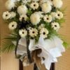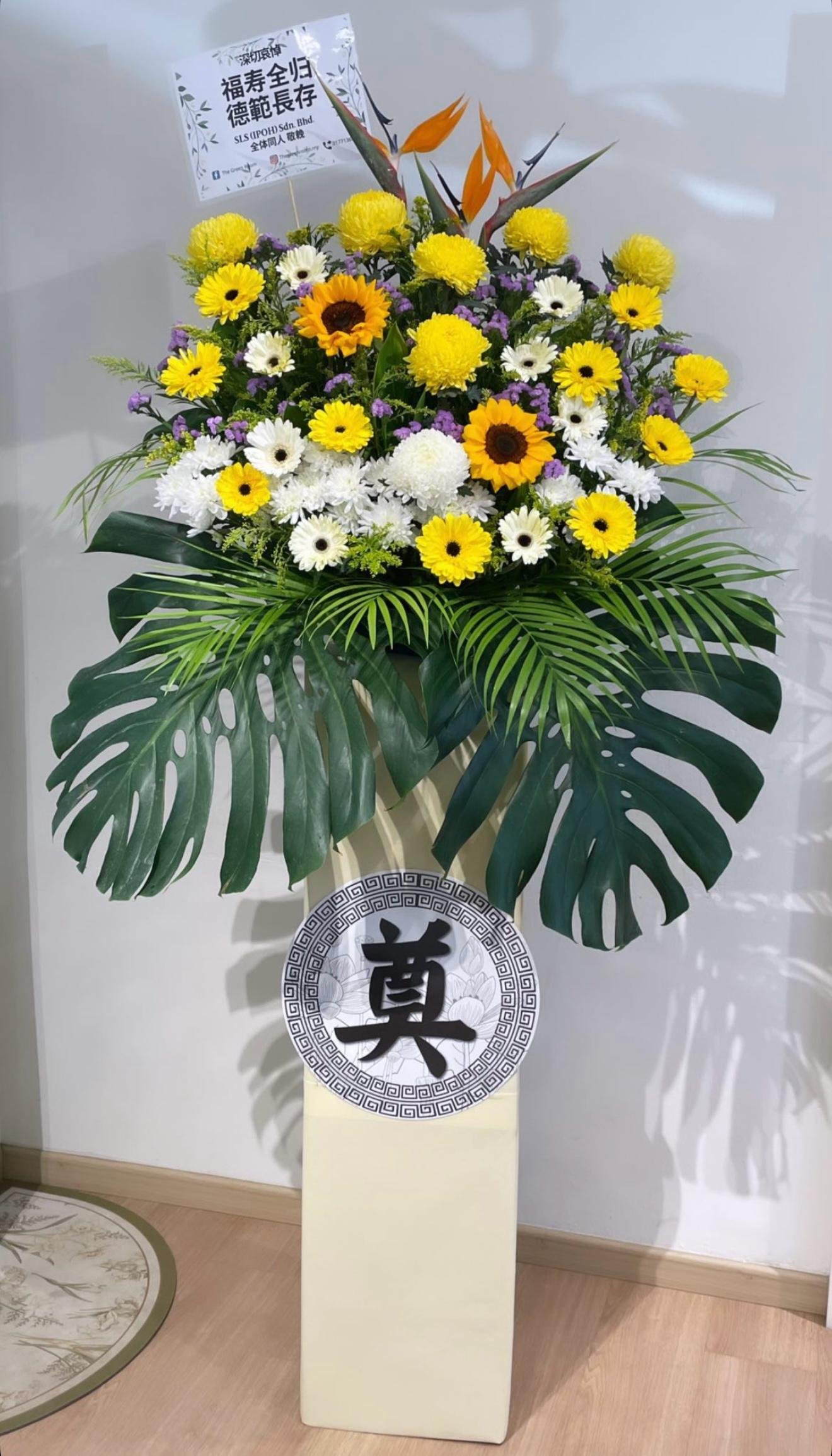 Bird of Paradise, Sunflower, White & Yellow Mum Chrysanthemum, White Chrysanthemum Pom Pom, White & Yellow Daisy Gerbera, Purple Statice, Monstera, Palm Leaves and Fillers.