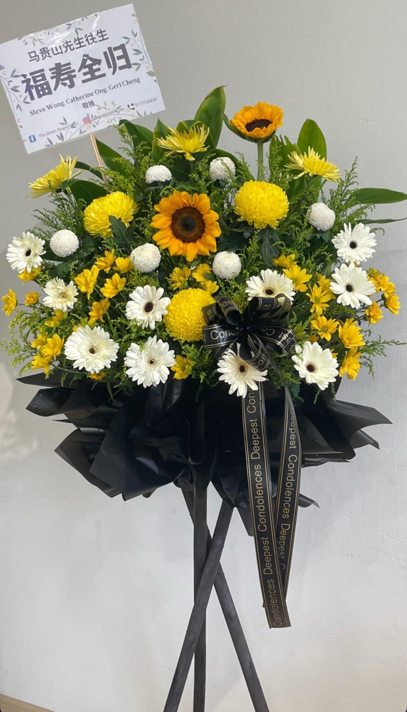 Sunflower, White Chrysanthemum Ping Pong, Yellow Mum Chrysanthemum, White Gerbera, Yellow Chrysanthemum Pompom and Fillers.