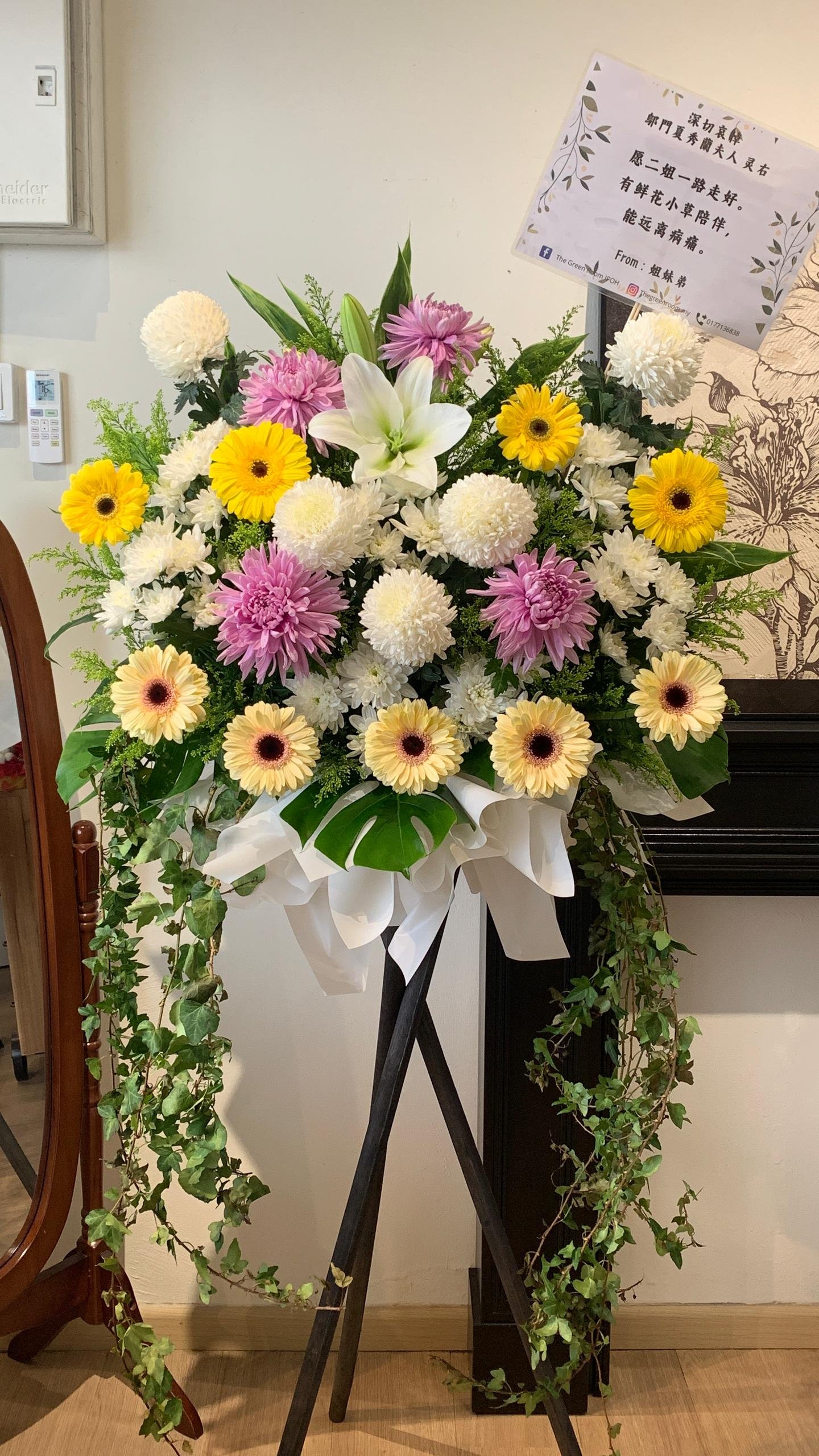 Lily, White Mum Chrysanthemum, Purple Mum Chrysanthemum, White Chrysanthemum Pompom, Daisy Gerbera, Monstera, Ivy Leaf and Fillers.