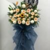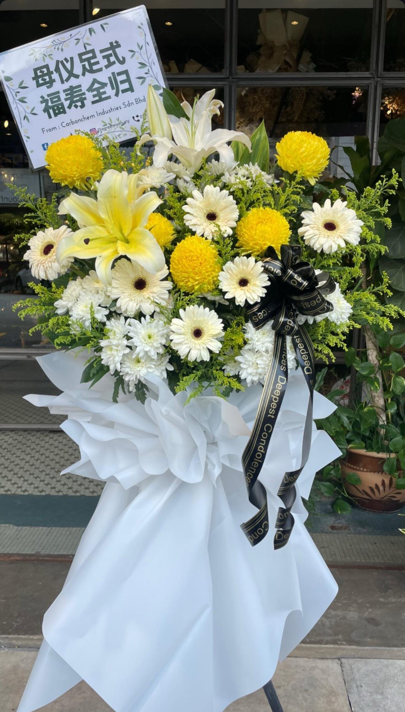 White Lily, Yellow Mum Chrysanthemum, White Gerbera, White Chrysanthemum Pom Pom and Fillers.