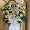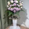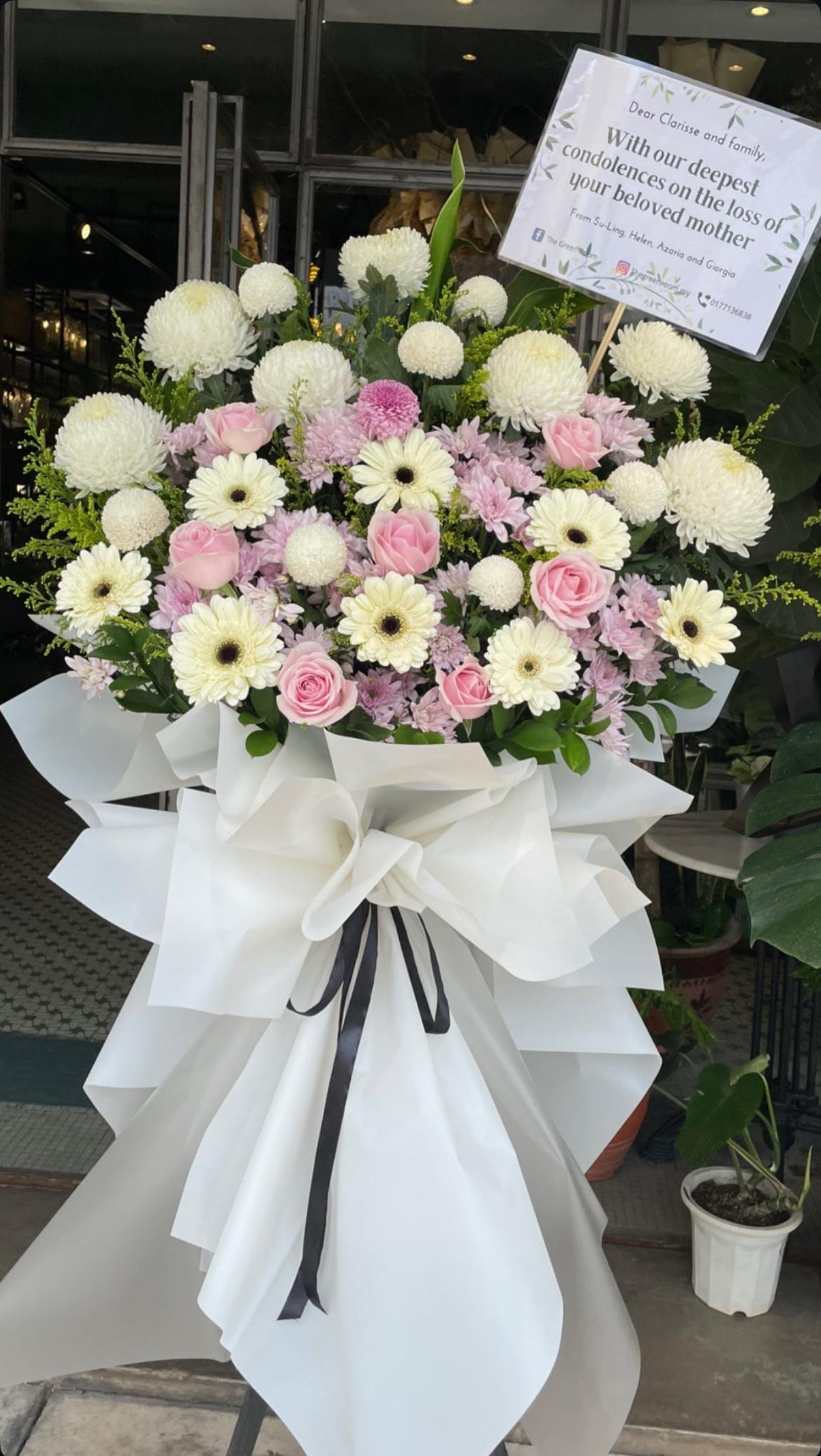 White Mum Chrysanthemum, White Gerbera, White Chrysanthemum Ping Pong, Purple Chrysanthemum Pom Pom, Pink Roses and Fillers.