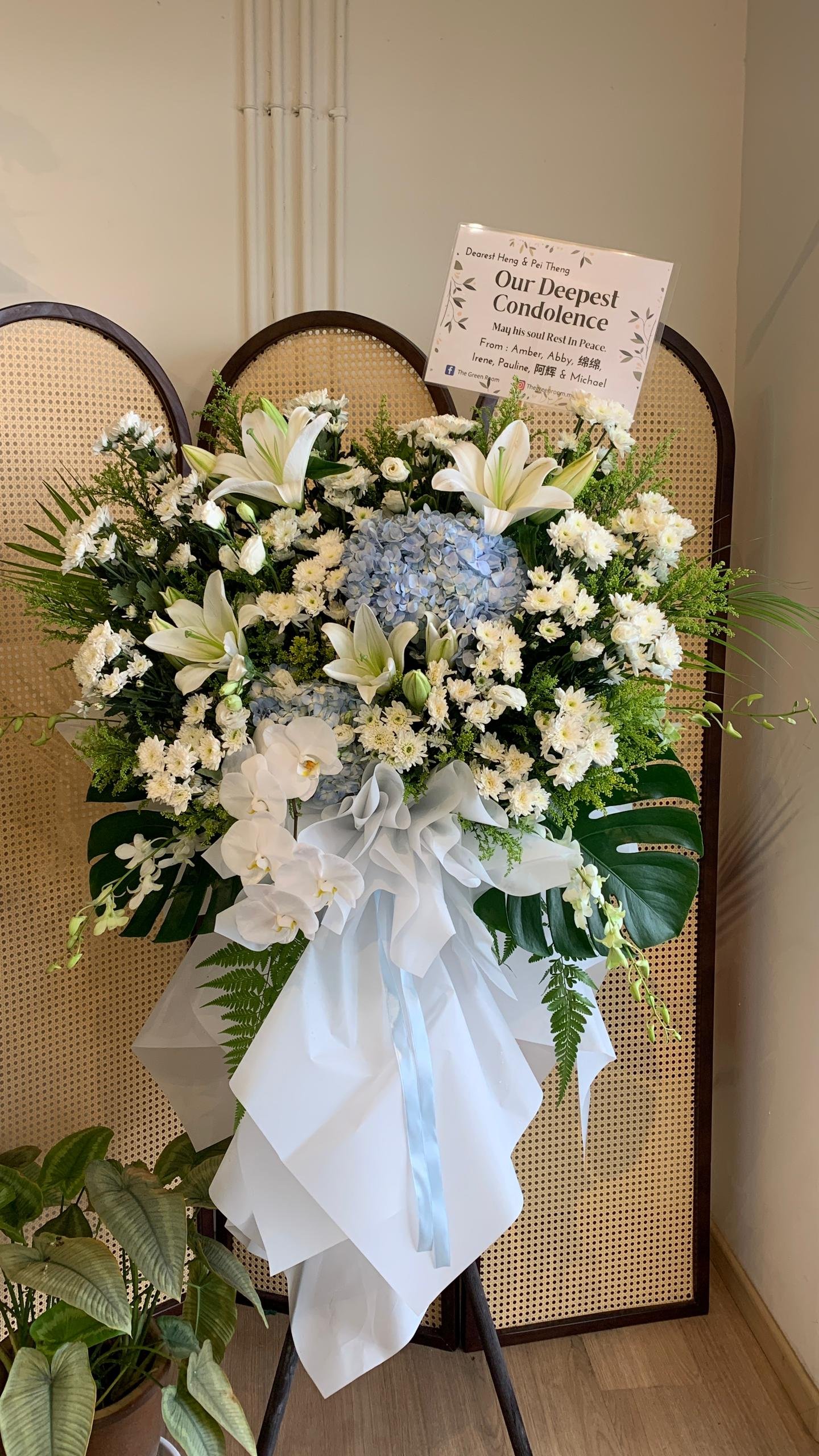 White Lilies, Blue Hydrangea, Blue Delphinium, White Chrysanthemum Pom Pom, White Orchid, White Phalaenopsis, Palm Leaf and Fillers.