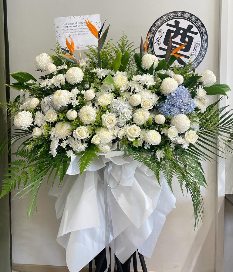 Blue Hydrangea, Bird Of Paradise, Whtie mum Chrysanthemum, White Rose, White Chrysanthemum Pingpong, White Chrysanthemum Pompom and Fillers.