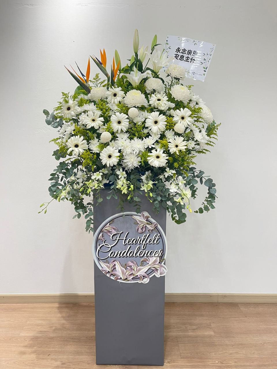 White Lily, White Mum Chrysanthemum, White Chrysanthemum Pompom, Bird of Paradise, White Daisy Gerbera, Orchid and Fillers.