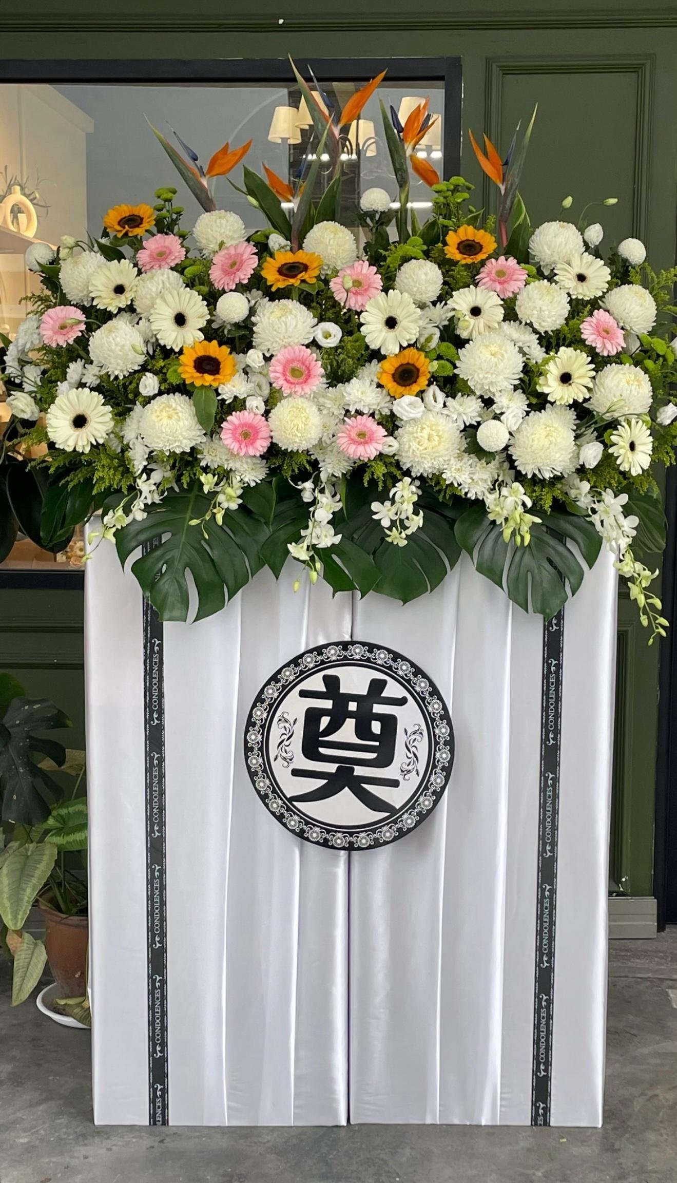 Sunflower, Bird of Paradise, White Mum Chrysanthemum, White Chrysanthemum Ping Pong, White Chrysanthemum Pom Pom, Pink and White Gerbera, Dancing Lady, Eucalyptus Baby Blue, Monstera and Fillers.