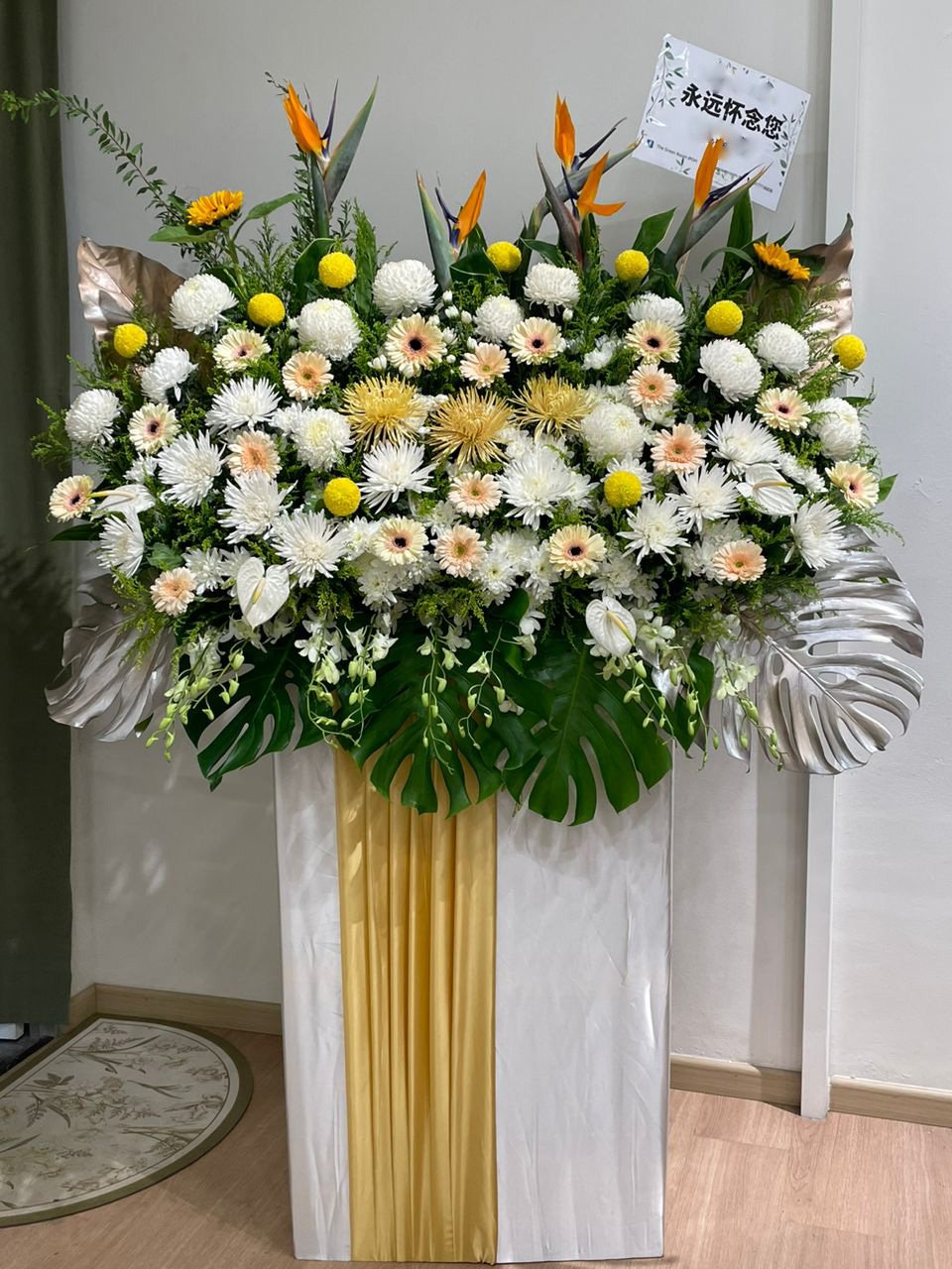 White Anthurium, Bird Of Paradise, Sunflower, Yellow Chrysanthemum PinngPong, White Mum Chrysanthemum, Light Yellow Gerbera, Chrysanthemum Pompom, Orchid and Fillers.