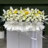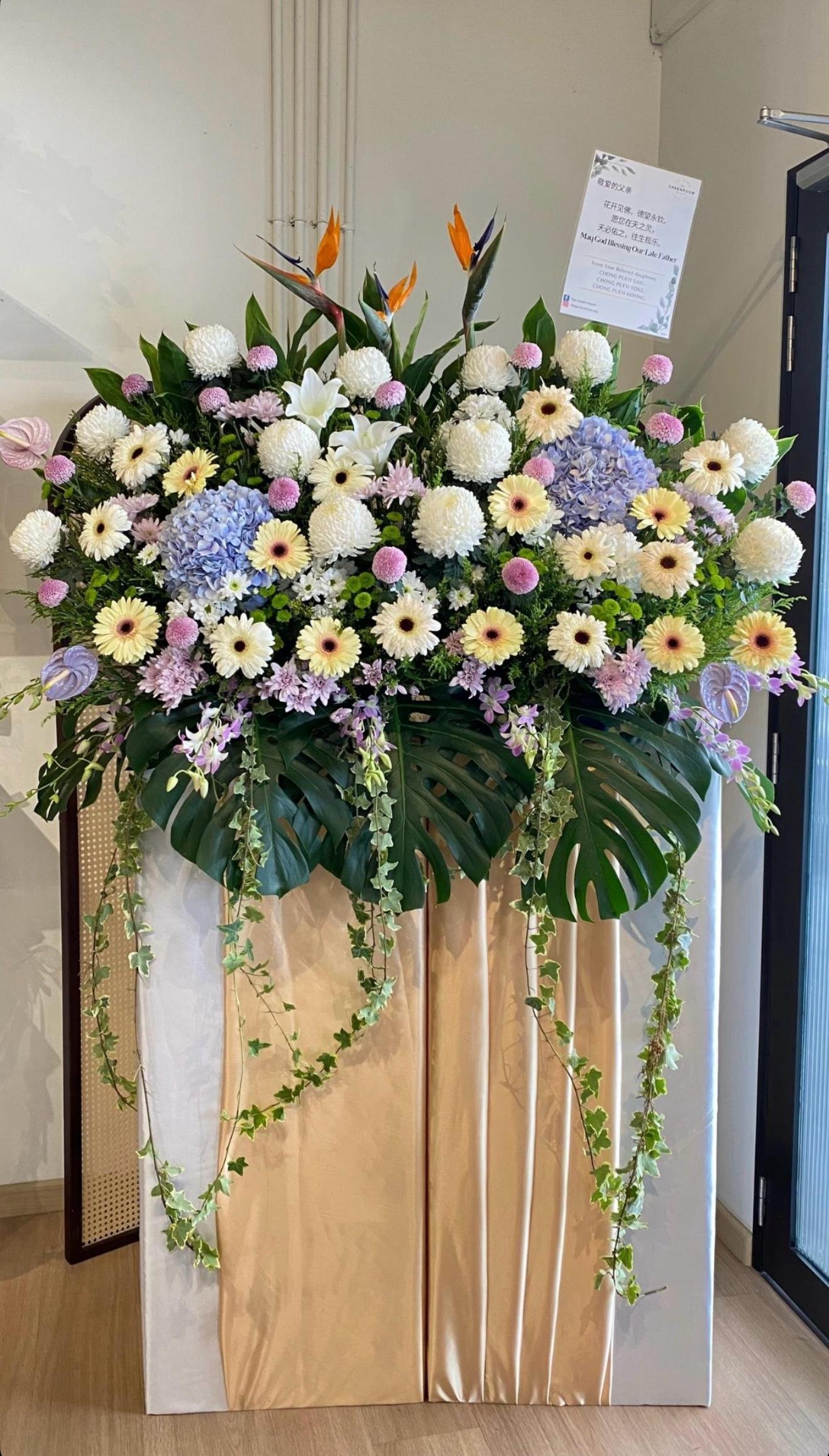 White Lily, Bird Of Paradise, Purple Chrysanthemum Ping Pong, White Mum Chrysanthemum, Chrysanthemum Pom Pom, Daisy Gerbera, Purple Orchid, Ivy Leaf and Fillers.