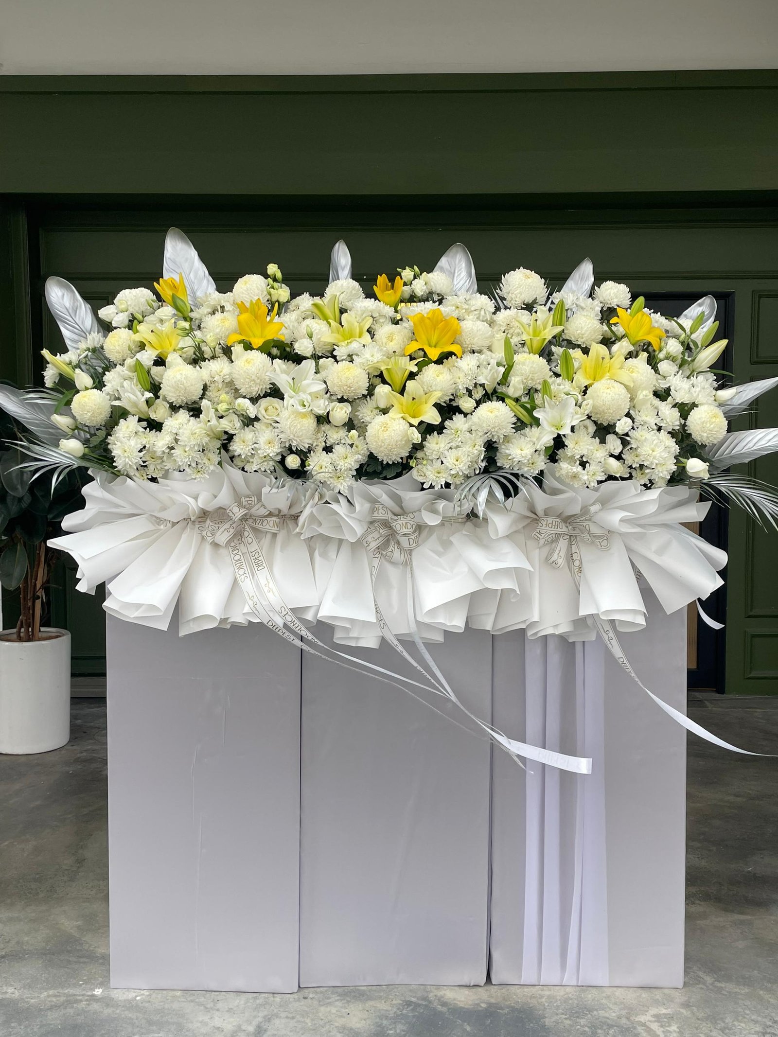 White and Yellow Lily, White Mum Chrysanthemum, White Chrysanthemum Pom Pom, White Roses, White Eustoma, Palm Leaf and Fillers.