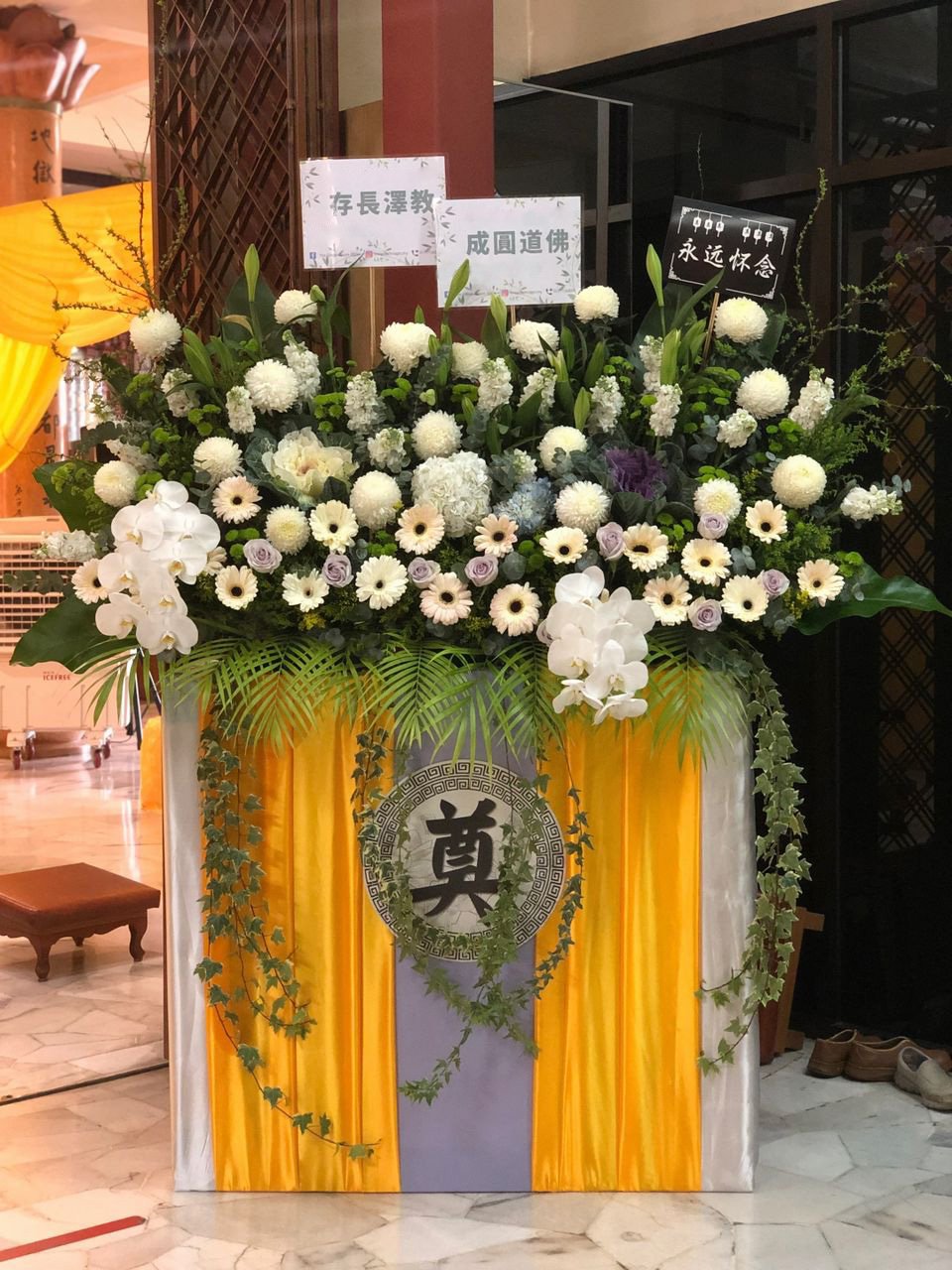 Phalaenopsis Orchid,White & Blue Hydrangea, White Matthiola, Lily, Purple & White Brassica, White Mum Chrysanthemum, White Gerbera, Roses and Fillers.