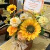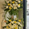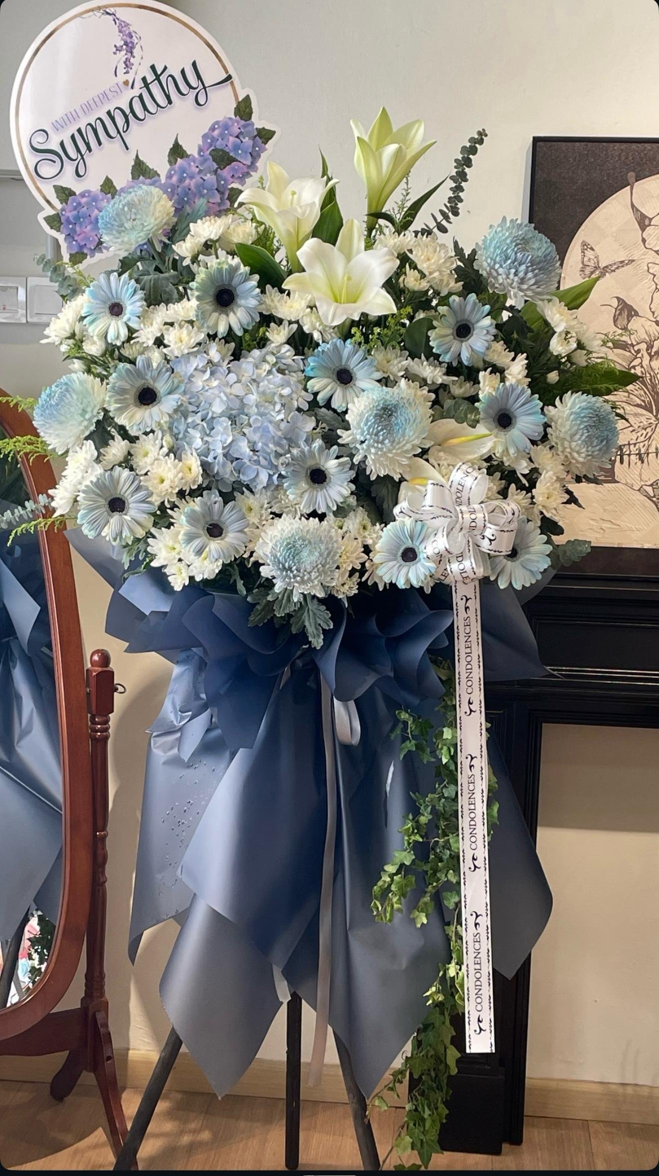 Blue Hydrangea, White Lily, White Daisy, White Mum Chrysanthemum, White Chrysanthemum Pom Pom, White Anthurium, Eucalyptus Baby Blue, Ivy Leaves and Fillers.