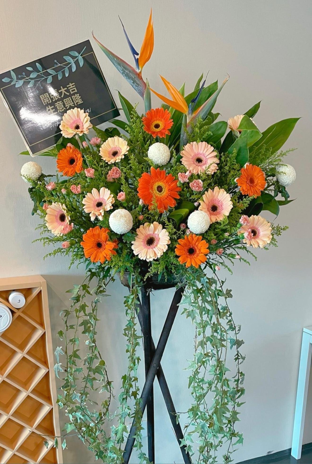 Bird of Paradise, Orange and Champagne Daisy, White Ping Pong, Spray Carnation, Ivy Leaf and fillers