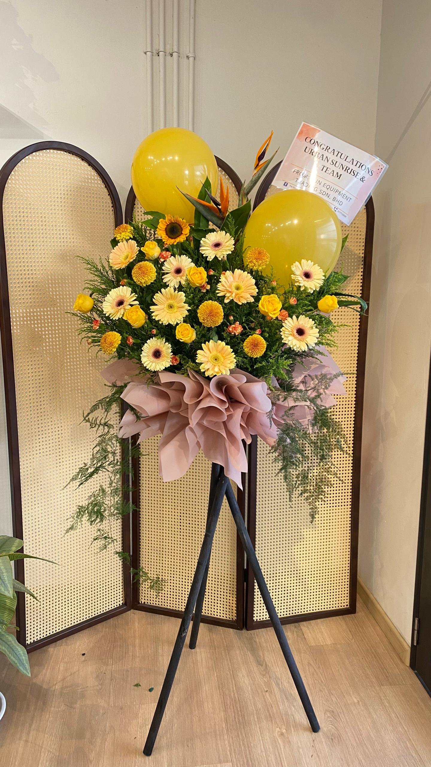 Sunflower, Bird of Paradise, Yellow Ping Pong, Daisy Gerbera, Yellow Rose, Orange Spray Carnation and Fillers