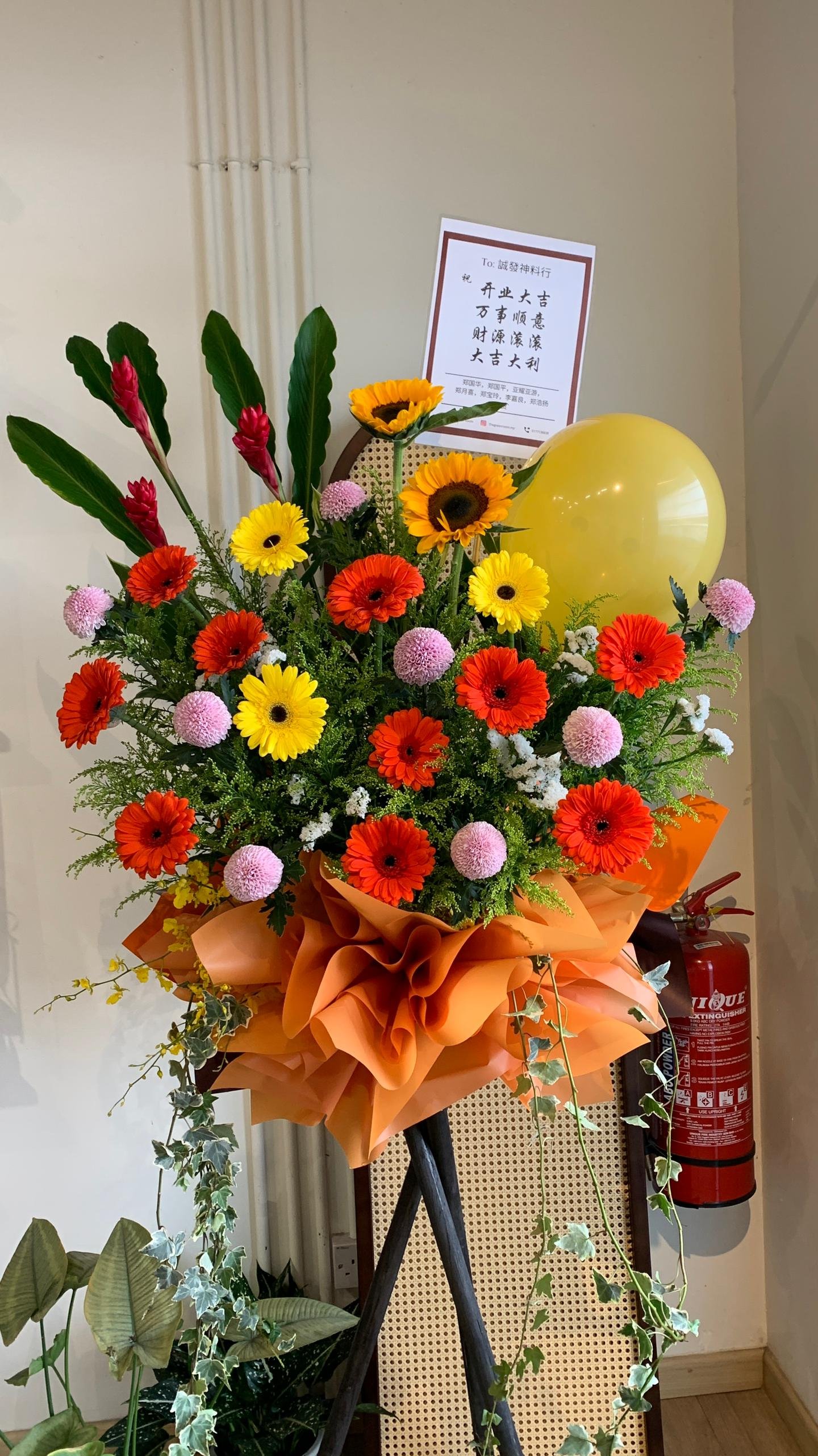 Sunflower, Red Ginger, Yellow & Red Daisy Gerbera, Purple Ping Pong, Ivy Leaves and Fillers