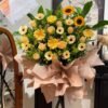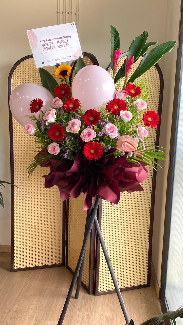 Sunflower, Red Ginger, Pink Authorium, Red Daisy Gerbera, Pink Rose, Purple Statice, Palm Leaves and Fillers