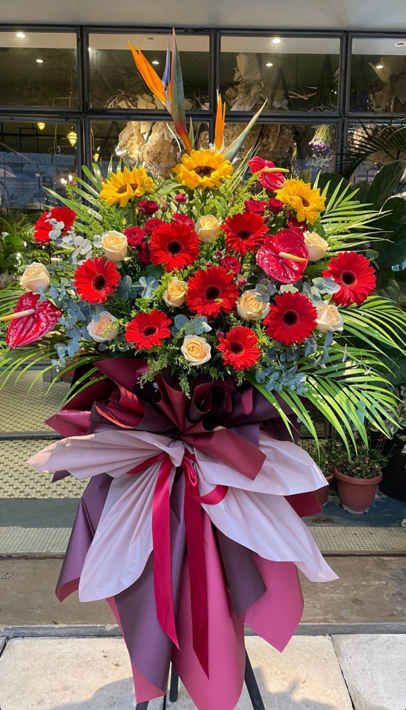 Bird of Paradise, Sunflower, Red Daisy Gerbera, Champagne Rose, Red Anthurium, Palm Leaves and Fillers