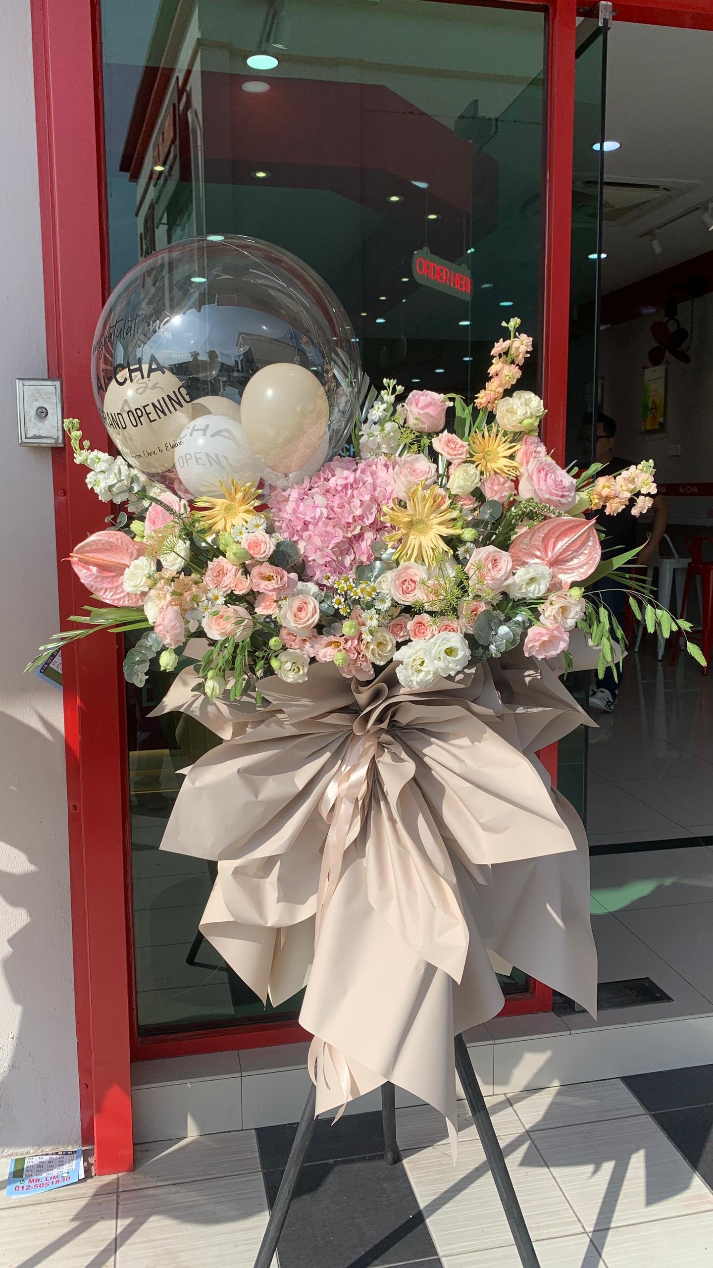Pink Hydrangea, Daisy Gerbera, Soft Pink Roses, White Eustoma, ,Mathiola, Pink Anthurium, Chamomiles, Chasmanthium Latifolium and Fillers