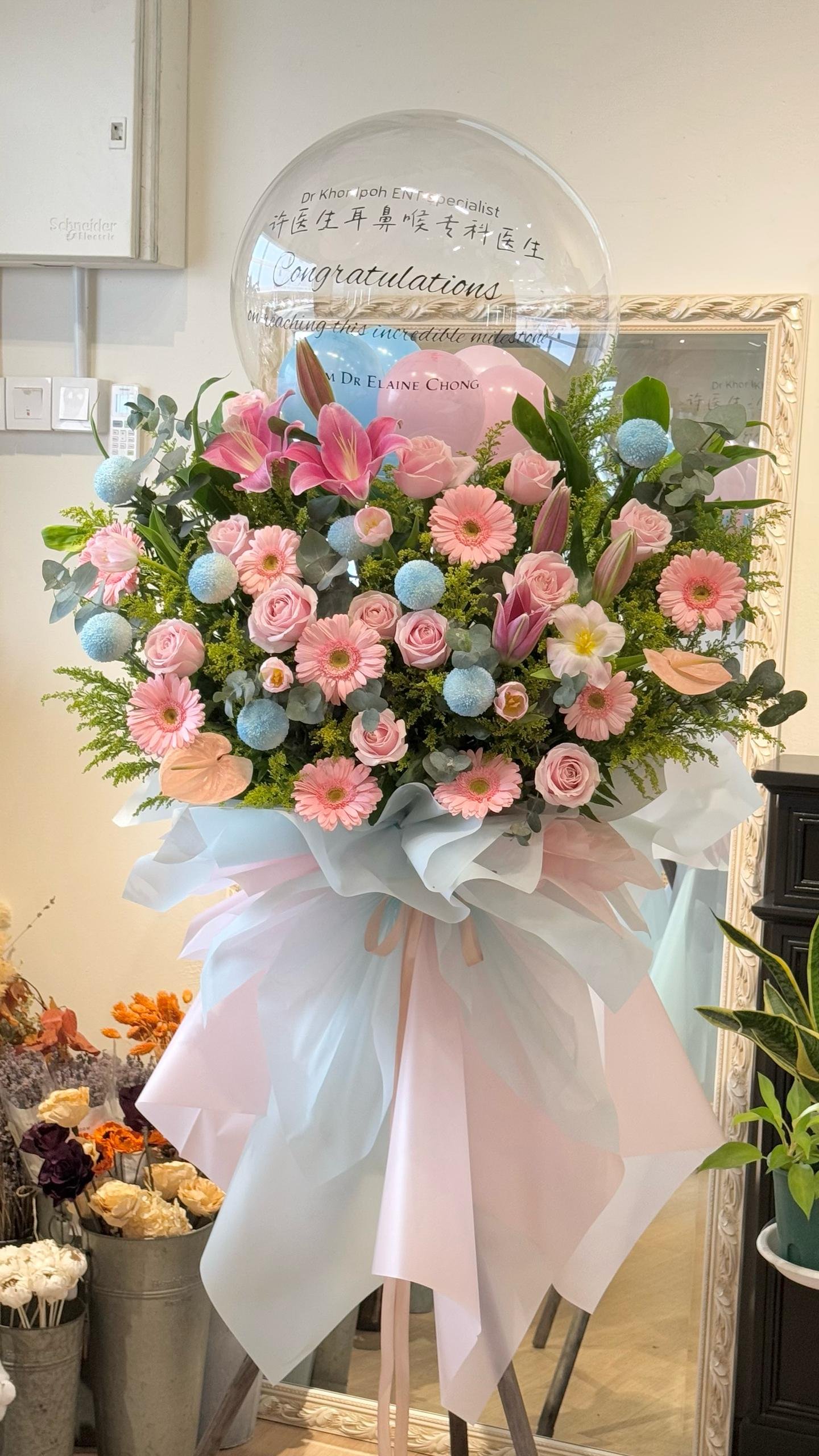 Pink Lily, White Ping Pong, Pink Daisy Gerbera, Pink Roses, Pink Anthurium and Fillers