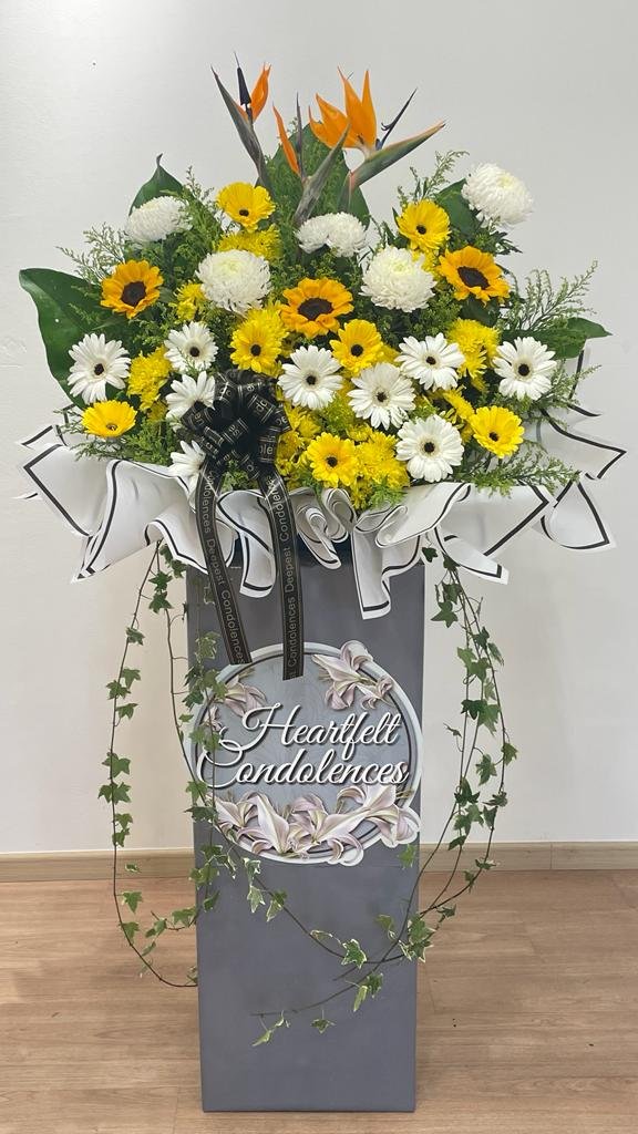 Blooms Bird Of Paradise, Sunflower, White Mum Chrysanthemum, White & Yellow Gerbera, Orchid, Yellow Chrysanthemum Pompom and Fillers. Size 75 cm (W) x 175 cm (H) Perfect for Condolence, Funeral