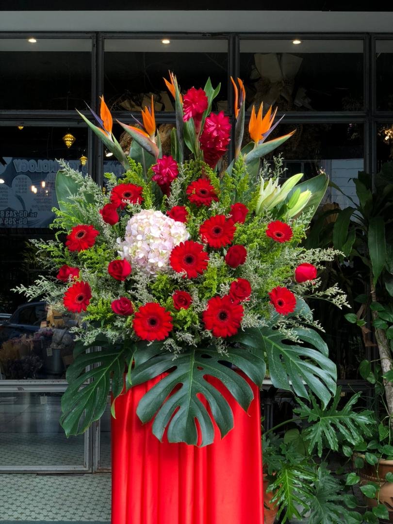 Pink Hydrangea, Bird of Paradise, Red Ginger, Lily, Red Daisy Gerbera, Red Roses, Monstera and Fillers