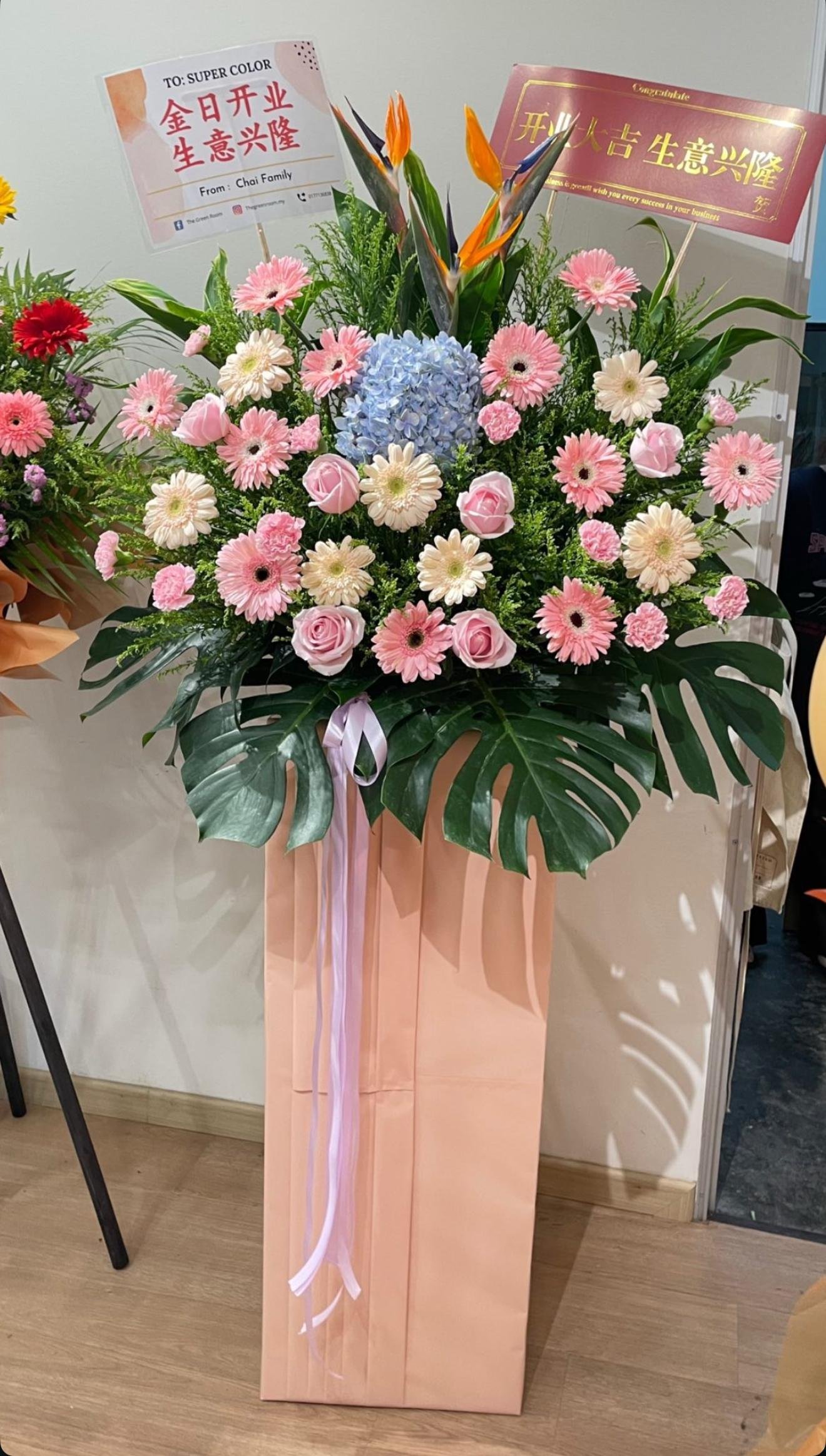 Blue Hydrangea, Bird of Paradise, Champagne & Pink Daisy, Pink Rose, Pink Carnation, Monstera and Fillers