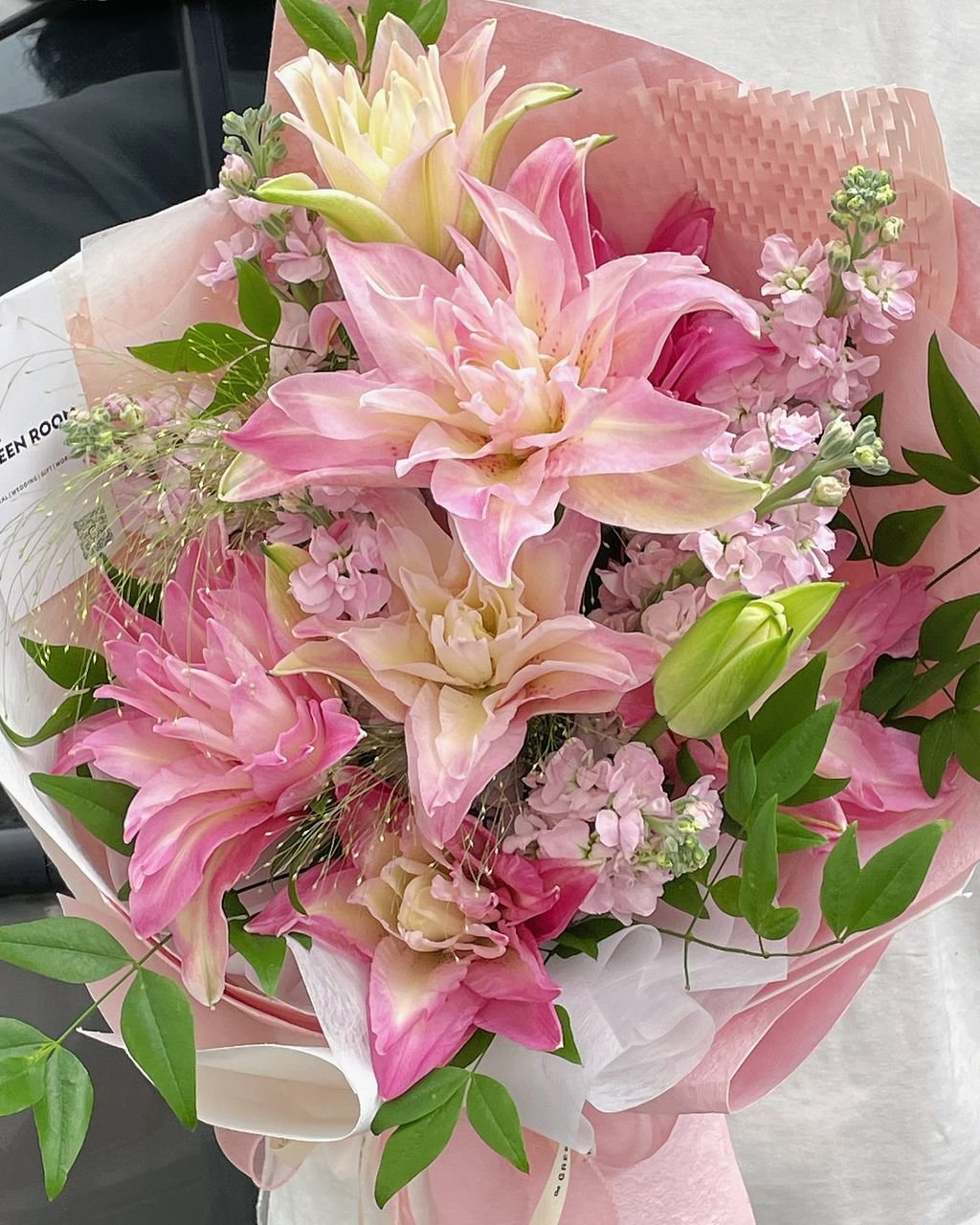 Pink rose lily, pink mathiola and fillers